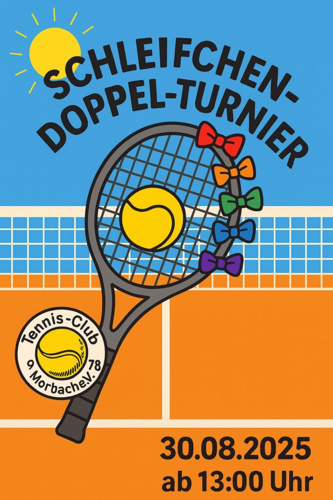 Am Samstag, 30.08.2025, ab 13 Uhr bieten wir wieder ein Doppel-Schleifchenturnier an; die Doppelpaarungen werden zugelost und wir achten auf ausgeglichene Teams; es wird auf Zeit gespielt und jeder hat mindestens 3-4 Spiele (je nach Teilnehmer); das Turnier ist für JEDEN geeignet! Anmeldungen sind ab sofort möglich bei einem der Vorstandsmitglieder … PS: Unterstützung beim Grillen, Kuchen 🍰 backen oder Thekendienst ist noch möglich und erwünscht 😉) … Wir freuen uns auf euch ☀🎾😎…